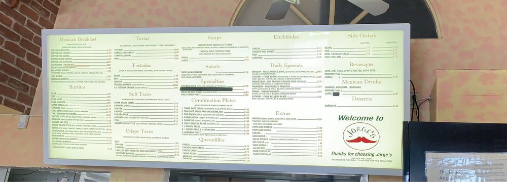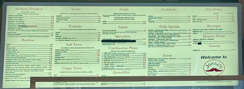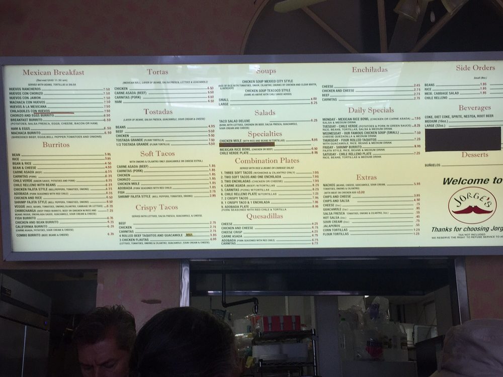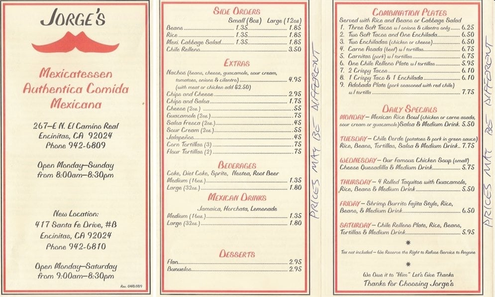 Introducing the menu at Jorge's Mexicatessen, a Mexican restaurant located in Encinitas, CA. Known for their delicious chile relleno burritos, chicken tortilla soup, and breakfast burritos with homemade tortillas, this spot offers a range of vegan and vegetarian options. Customers praise the friendly service and clean restroom facilities, making it a great choice for lunch or dinner. With takeout, delivery, and catering options available, Jorge's Mexicatessen is a convenient and tasty choice for Mexican cuisine lovers. Don't miss out on their famous chicken soup, made fresh daily in-house. Visit them at 417 Santa Fe Dr Ste B and experience the flavors of Mexico at Jorge's Mexicatessen.